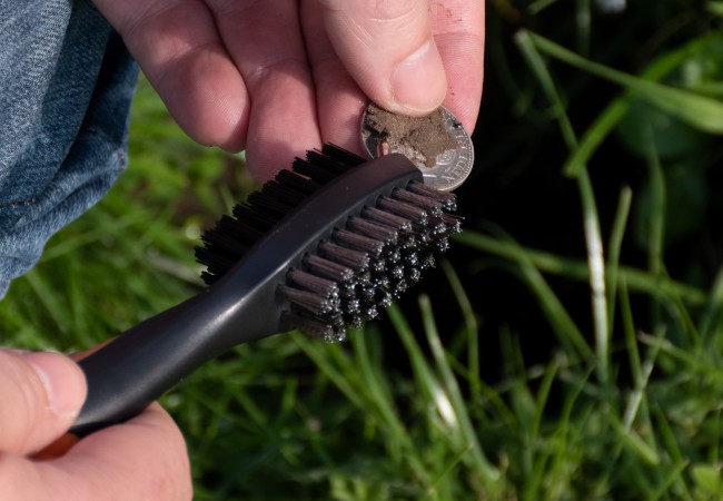 Na het uitgraven van uw vondsten kunt u de waardevolle objecten zoals zilveren, koperen of gouden munten met de kunststof borstel reinigen. De ijzeren vondsten kunt u met de staalborstel reinigen. De borstel heeft boverop een stalen punt, waarmee u smalle groeven kunt uitkrassen. Na het reinigen kunt u uw vondsten meteen onder de loep nemen om onleesbare jaartallen, keurmerken of teksten af te kunnen lezen om hiermee de vondsten te kunnen determineren.